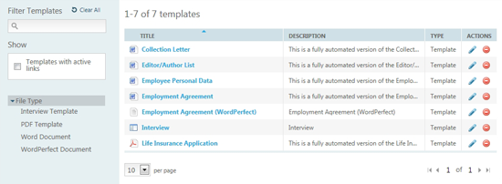 The template tab allows the user to search and view the document templates that they have access to. Templates can be made available to be used by uploading created templates through HotDocs Developer 10.