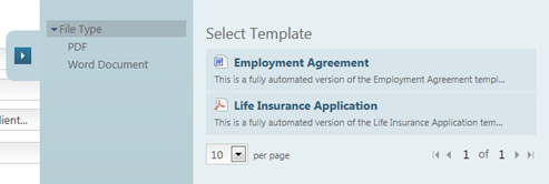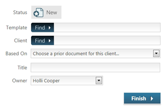 The Add Document page allows the creation of a new document based on a selected template. It can be accessed through the New Document links, through the template page or by creating a new document for a client. If the New Document page is accessed through the template or client page the Template / Client fields will be automatically filled in.