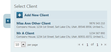 A client must then be selected. A client can be selected from the client list displayed or by creating a new client. You can view the filter options for the list of clients by clicking on the left arrow.
