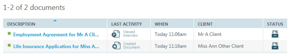 Documents Table: The main documents panel shows all the available documents in a tabular format which displays the document description, the last activity performed on the document, when that activity took place, and the user responsible for the document. It also details the client to whom the document is attributed to and the current document status.