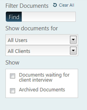 Filtering the document list: The filter panel enables the document table to be searched by keywords in the document detail, as well as by the document user and by a specific client. When entering text into the ‘Find’ input box the table will filter the documents automatically as the search criteria is entered. The ‘Show documents for’ filter will be set by default to the currently logged in user. The documents table will not show documents that have been archived or documents that are pending a client interview; however these can be viewed by selecting the ‘Archived documents’ and ‘Documents waiting for client interview’ check boxes respectively. Information about Client Interview.