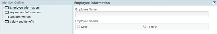 Interview Outline: The interview outline shows a list of dialogs (grouped questions) that are available for data input. Selecting any of the available dialogs will show the particular question associated with it.