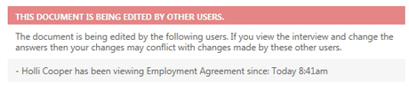 Document Warning: If you try to open a document that is currently being edited by another user you will see the following warning. If you continue on and open the interview you should be aware that any changes you make to the answers may conflict with changes the other user is making.