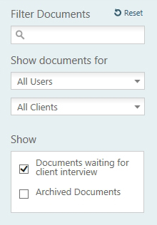The documents table does not show archived documents or documents that are pending a Client Interview Help; however you can choose to include these by selecting the ‘Archived documents’ and ‘Documents waiting for client interview’ check boxes respectively.