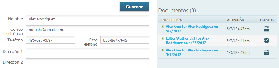 La página de detalles del cliente le presenta toda la información relacionada con el cliente. Esta le permite editar los la información del cliente, añadir usuarios para dicho cliente y también ver los documentos relacionados con el cliente. Estos documentos pueden ser abiertos haciendo clíc en la descripción del documento.