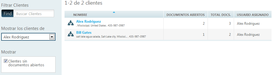 Lista de Clientes: Cuando usted navegue a la ficha de clientes, la lista de clientes que le pertenecen al usuario que inició la sesión serán mostrados. La opción para ver todos los clientes se encuentra en el panel de Fitrar. Aparte de el nombre de los clientes, tambien el número de documentos abierto y el número total de documentos es desplegado. El usuario que fue asignado al cliente tambien es mostrado.