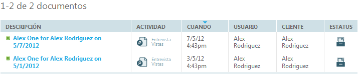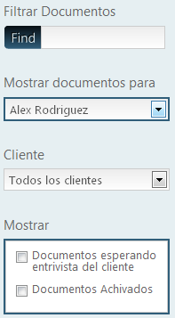 Filtrar Documentos: el panel para filtrar documentos hace posible poder buscar documentos escribiendo palabras que existen en la columna de Descripción, tanto como por usuario y cliente también. Cuando texto es escrito en el campo de texto ‘Find’, los documentos en los cuales se encuentren tal palabra serán automaticamente actualizados. El Filtro ‘Mostrar’ es automaticamente configurado para el usuario que inició sesión. La tabla de documentos no mostrará documentos con el estatus ‘Archivados’ status ó esperando entrevistas de clientes; sin embargo, estos pueden ser vistos haciendo clíc en las casillas ‘Documentos Archivados’ y ‘Documentos esperando por entrevista de clientes’. Información sobre Entrevista a cliente.