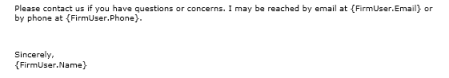 Ejemplo: El Mensaje Electrónico para Invitación a la Entrevista debe contener el logo de la organización al final de el mensaje electrónico( el logo de la organización debe ser subido en la ficha de configuraciones generales para que esta esté disponible). Haga clíc en la ficha { Firm.LogoUrl } para añadir el logo en la parte deseada. El logo será añadido cuando el mensaje electrónico sea creado.